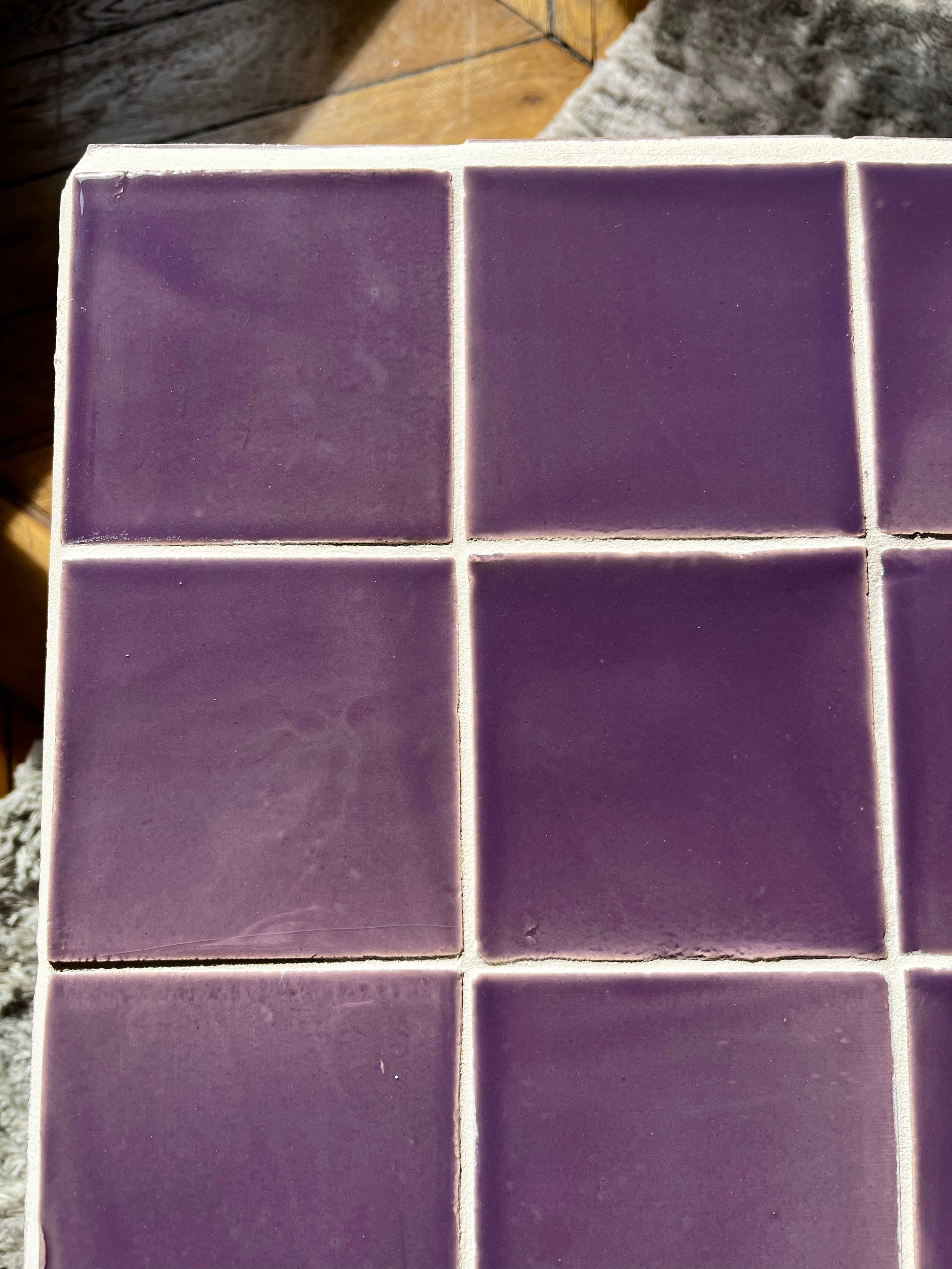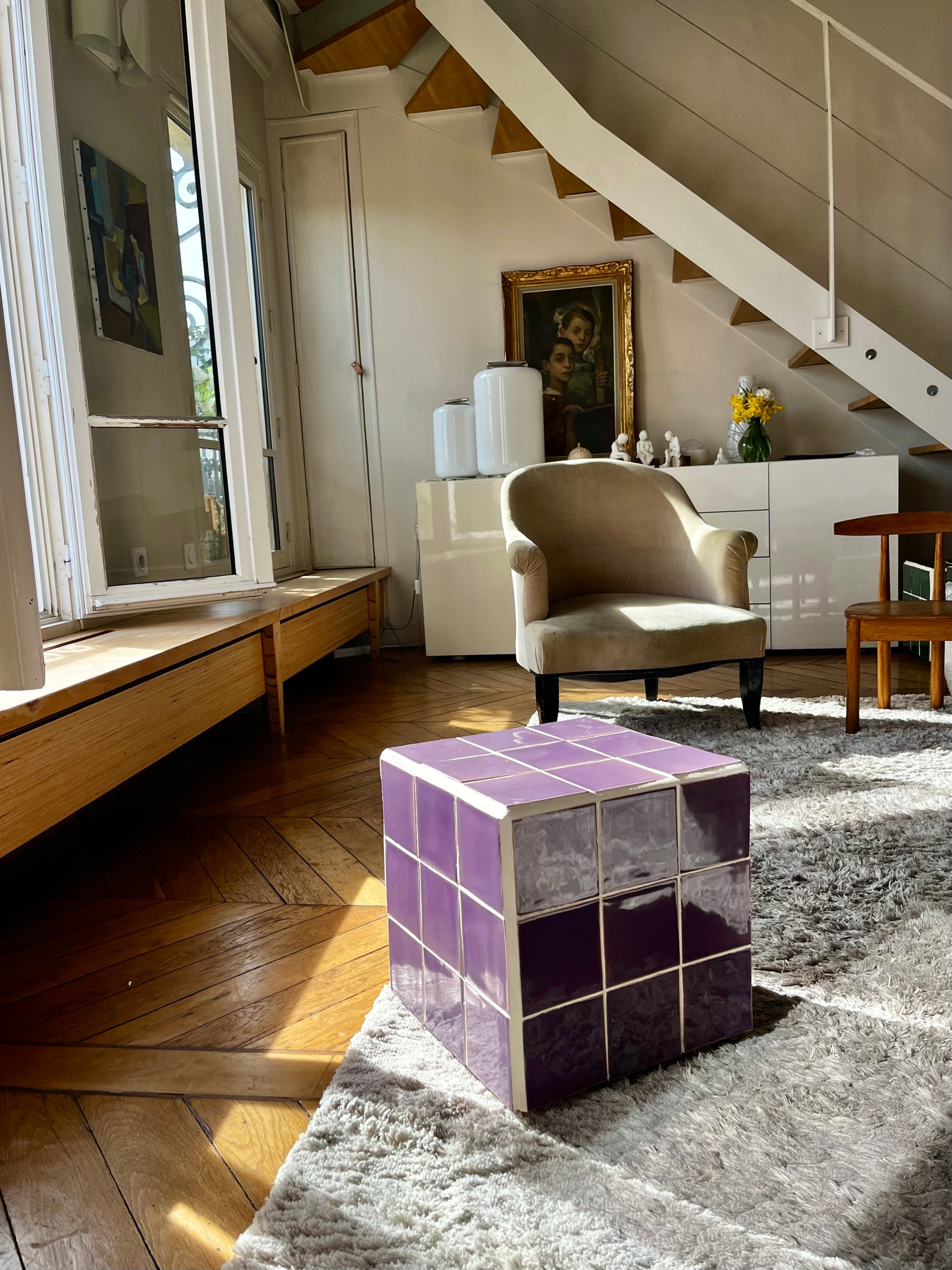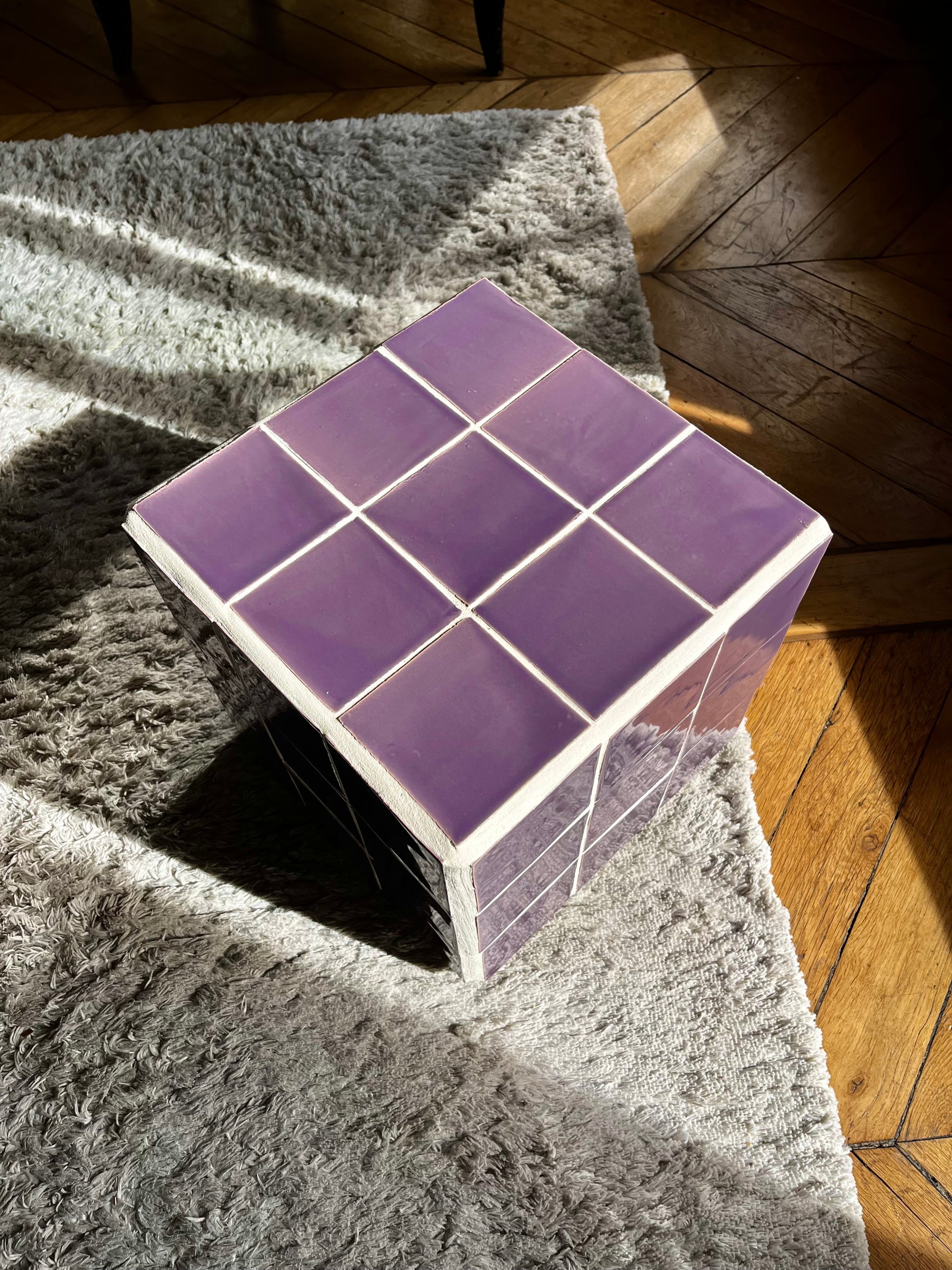 The So Eggplant cube can be used as a side table or as a stool. It is covered with ceramic tiles that are handmade and painted with a mix of different glazes. Thanks to multiple layers of glazing and several firings, we obtain this very unique eggplant colour. Because each tile is hand-painted, your furniture is a unique piece of collection.